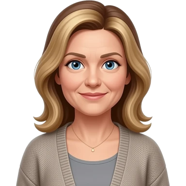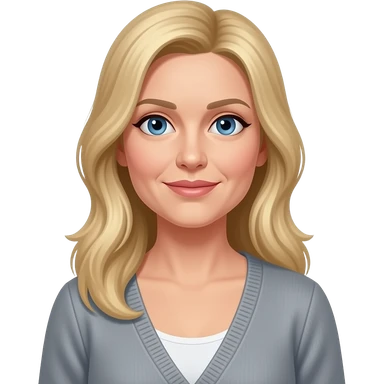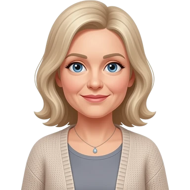 Blue eyes, fair skin, longer blonde hair, medium height, medium frame, middle aged women, cardigan, grey top emoji