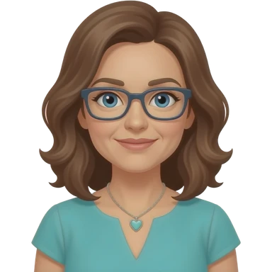 AJM - woman, mid 40's age, mid brown hair, rectangular glasses, shoulder length wavy hair, tiffany heart necklace, blue eyes, teal dress, emoji