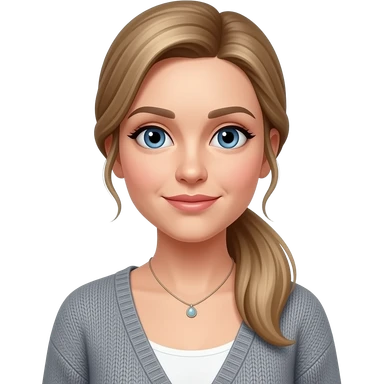 Blue eyes, fair skin, longer blonde/brown hair pony tail, 30 aged women, cardigan, grey top,small necklace emoji