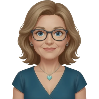 AJM - woman, blue eyes, mid 40's age, light brown hair, rectangular glasses, shoulder length wavy hair, small tiffany heart necklace, dark teal dress, emoji