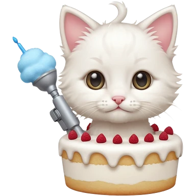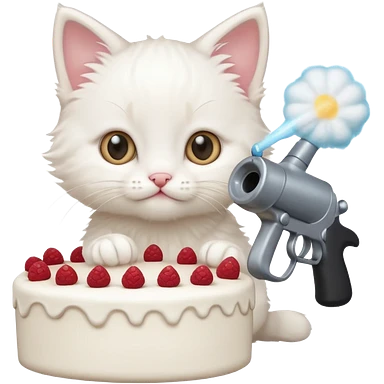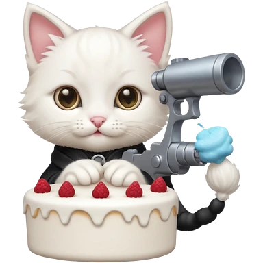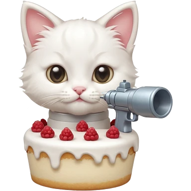 реалистичный белый котенок стреляющий из пороховой пушки тортиком emoji