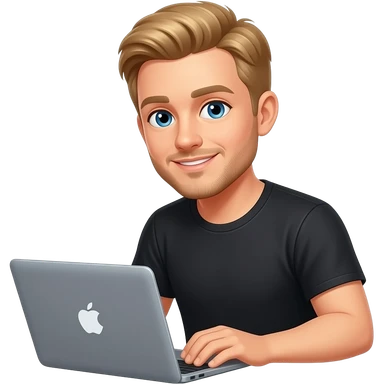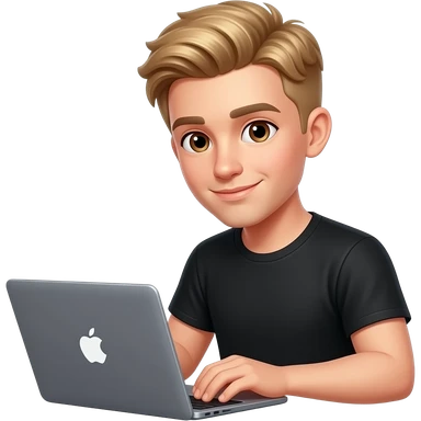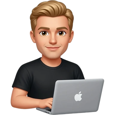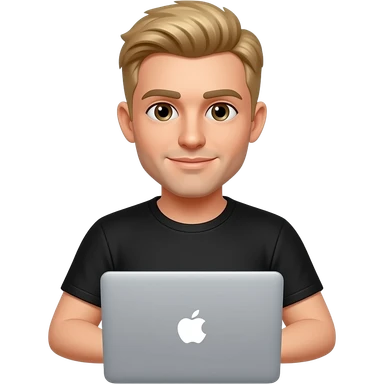 Блондин c короткой стижкой парень в черной футболке без бороды с карими глазами сидит за ноутбуком apple emoji
