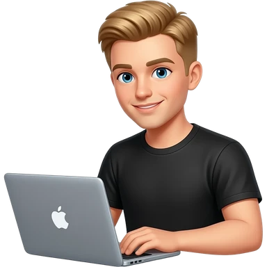 Блондин парень в черной футболке без бороды сидит за ноутбуком apple c короткой стижкой emoji