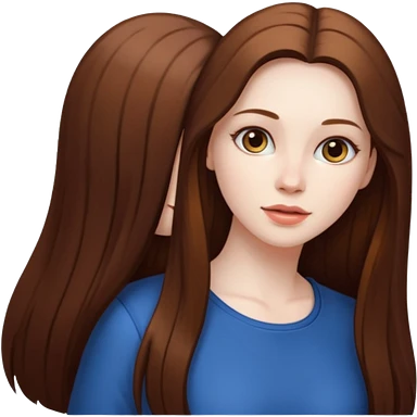 Aesthetic white girl with really long wavy/curly hair color dark brown, hair most be in front of the shoulders (hair in front of the shoulders). Big almond shape tired eyes color brown with dark circles, wide nose, natural lips, sweet expression. Dressed with a cute tight top color light pink. emoji