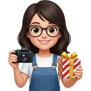 black haired girl wearing glasses with gifts and camera emoji