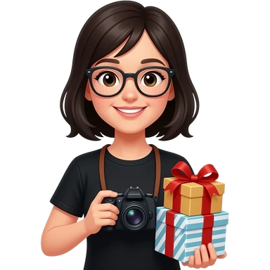 black haired girl wearing glasses and black shirt with gifts and camera emoji