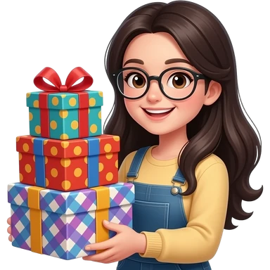 black haired girl wearing glasses with gifts emoji