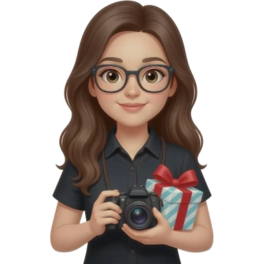 long haired girl wearing glasses and black shirt with gifts and camera emoji