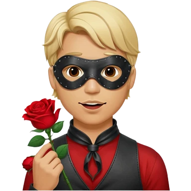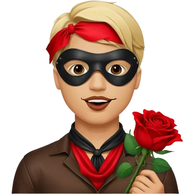 blonde man with leather eye mask and leather halter neck blouse, holding rose with his mouth emoji