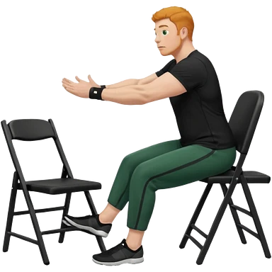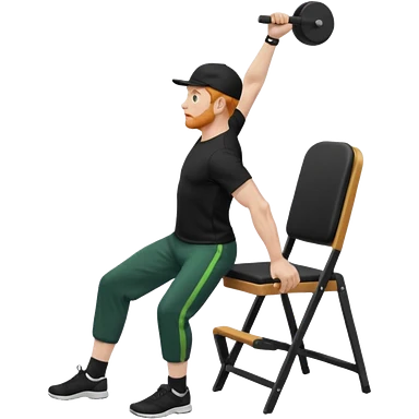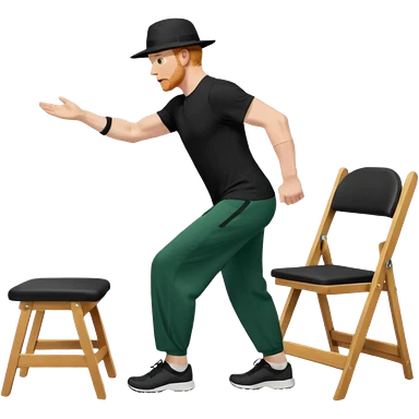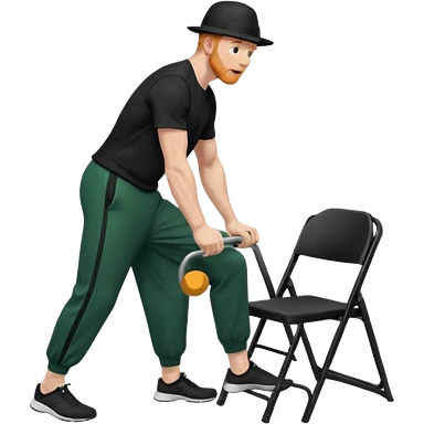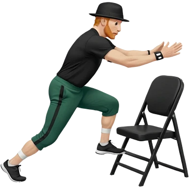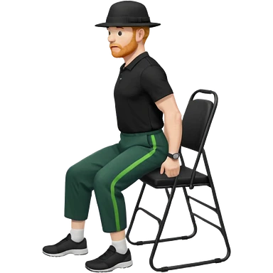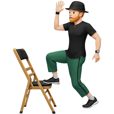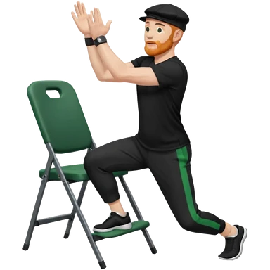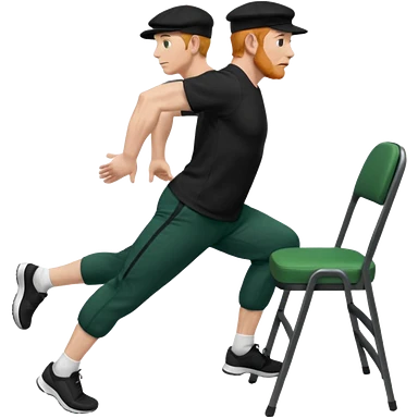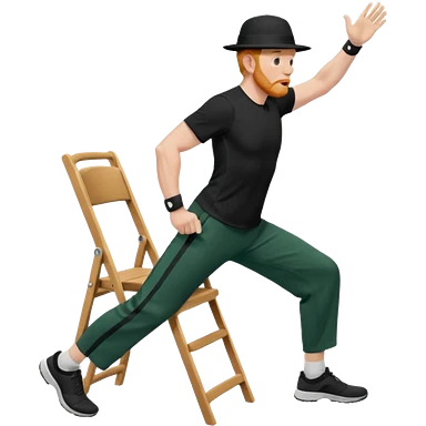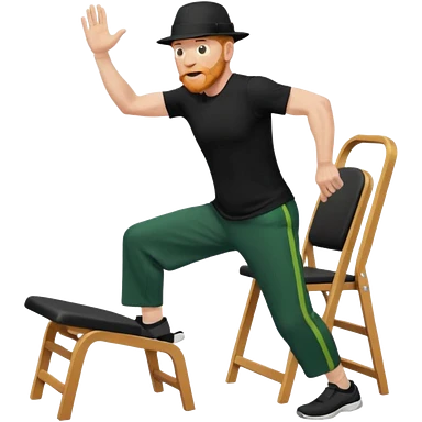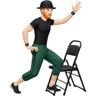 גבר זקן ג'ינג'י מלא כובע שחור הפוך חולמה שחורה ומכנסיים ירוקות ארוכות מבצע תרגיל לאנג' בתמיכת כיסא מהצד שתי רגליים על הרצפה מח^זיק כיסא בידו תמיכה קלה ידו על משענת הכיסא emoji
