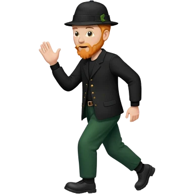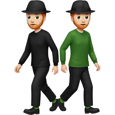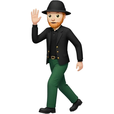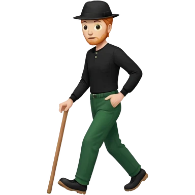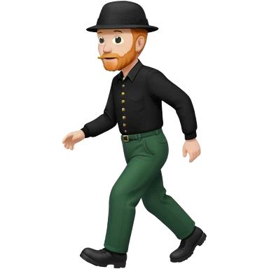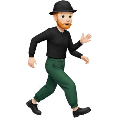 גבר זקן ג'ינג'י מלא כובע שחור הפוך חולמה שחורה ומכנסיים ירוקות ארוכות מבצע צעידה במקום emoji | AI Emoji Generator