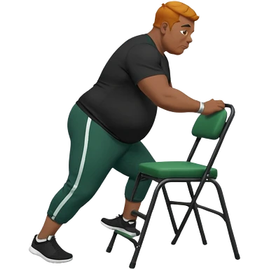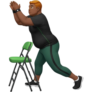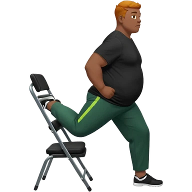 גבר זקן ג'ינג'י מלא כוסע שחור הפוך חולמה שחורה ומכנסיים ירוקות ארוכות מבצע תרגיל לאנג' בתמיכת כיסא מהצד שתי רגליים על הרצפה מח^זיק כיסא בידו emoji