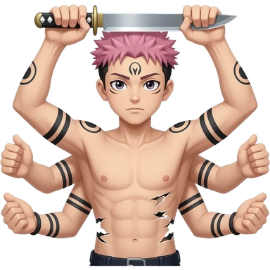 Sukuna the pink haired add a knife with a ball on the bottom of handle, a ball on the top then a knife ONTOP of that ball with also it has arm tattoos in circles on wrist and shoulders. Also no shirt and shredded abs4 arms and 4 eyes boy looks like yuji ITADORI but slicked back hair emoji