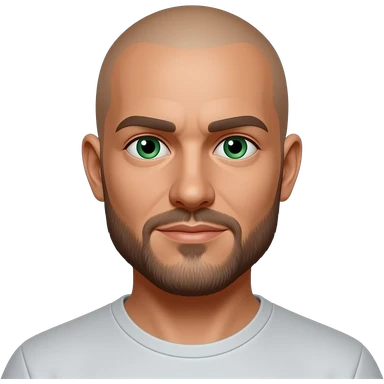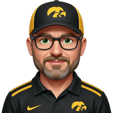 Bald 58 year old man with goatee and green eyes wearing Iowa Hawkeye gear emoji