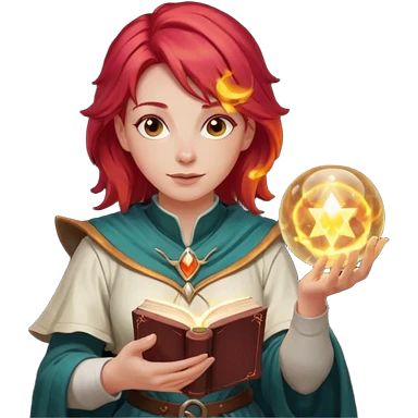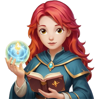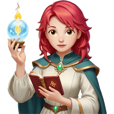 female dnd cleric with red hair holding a magic book in one hand and having a ball of light in the other emoji