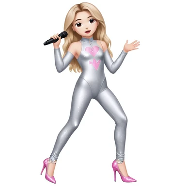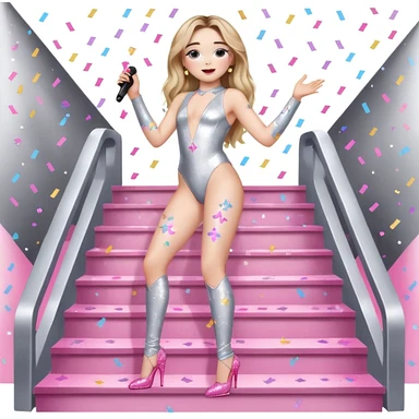 Sabrina carpenter singing at a concert wearing a silver bodysuit with kiss marks all over it pink sparkle heels. stage setting is very lit up with white stairs and confetti emoji