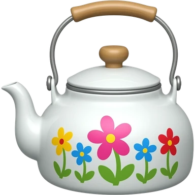 إبريق شاي: إبريق معدني أبيض مزين بنقوش زهور ملونة ويد خشبية. emoji