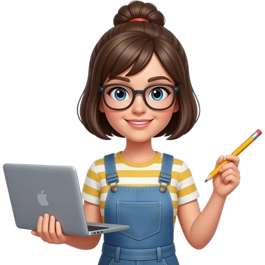 노트북과 연필을 각각 양손에 든 안경쓴 여자머리는 하나로 묶은 단발 이모티콘 emoji