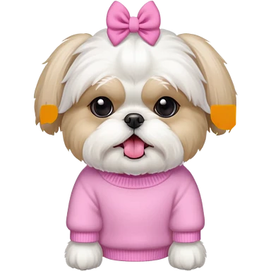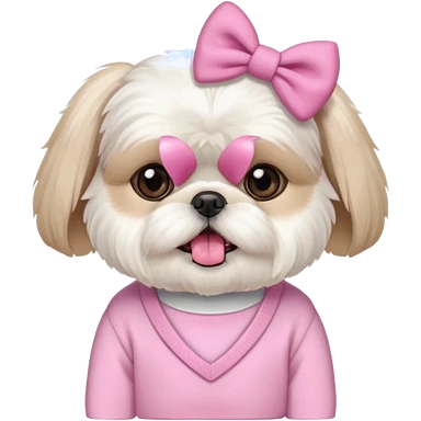 little all white shih tzu with pink bows & sweater tongue sticking out emoji