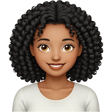 a young woman.She has voluminous, curly black hair long that frames her face beautifully. Her skin tone is black light and glowing, and she has a subtle, natural makeup look. She’s smiling softly at the camera. She is wearing a white top emoji