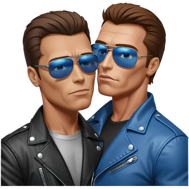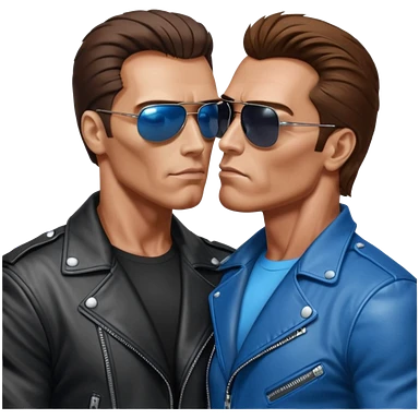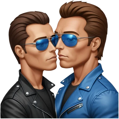 парень похожий на хилого Шварценегера-терминатора в косухе и очках-терминаторах целуется с высоким мужчиной шатеном с голубыми глазами кривым носом и косыми глазами. emoji | AI Emoji Generator