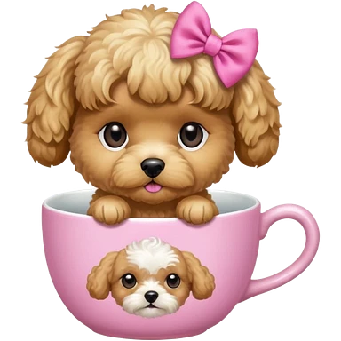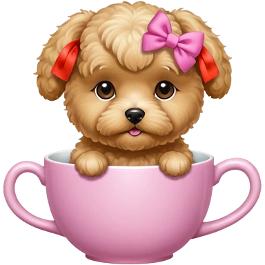 Golden maltipoo dog with pink bow k bow that is very poise make it have a cup of tea emoji