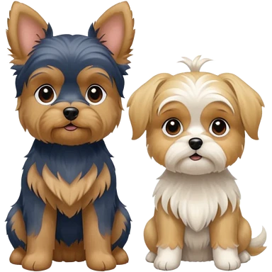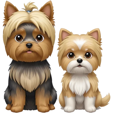Generate a blue and tan purebred yorkie with a blonde shi tzu yorkie mix with floppy ears sitting next to each kther emoji