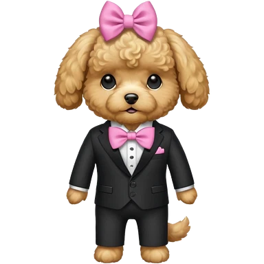Golden maltipoo dog with pink bow k bow that is very poise make it have a suit on emoji