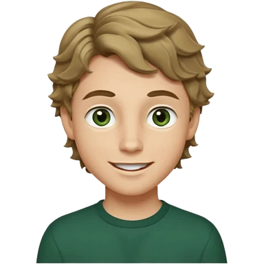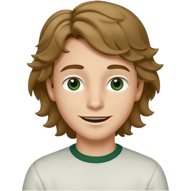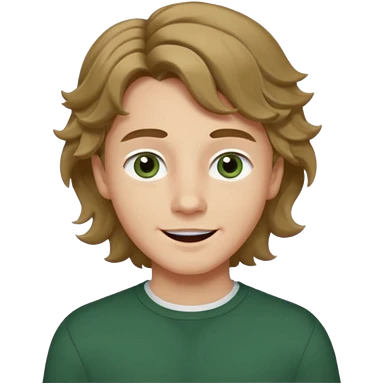 Сделай мальчика с длинными широким плечами в белом лонгсливе , немного темный блондин,волнистые волосы, flow cut, hunter green almond eyes,низко посаженные тёмные брови, немного большие губы губы,ехидная улыбка с зубами emoji | AI Emoji Generator