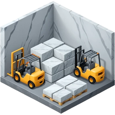 warehouse with forklifts and slabs of amrble stone isometric view from th outsideeslabs, forklifts, no vehicles no robots emoji