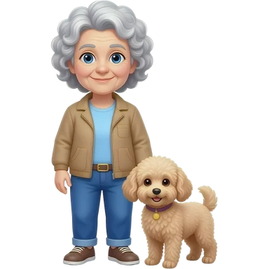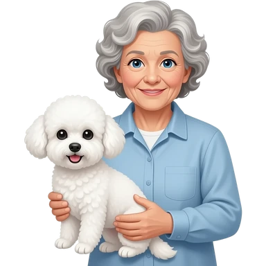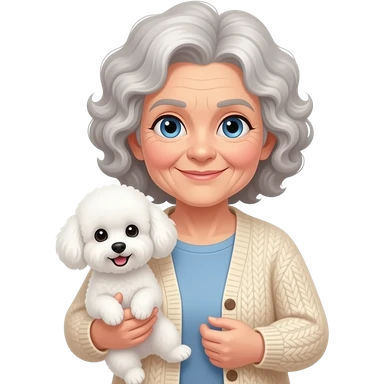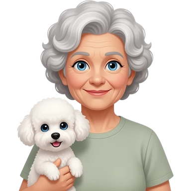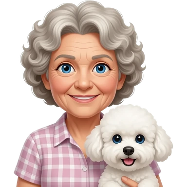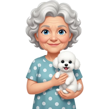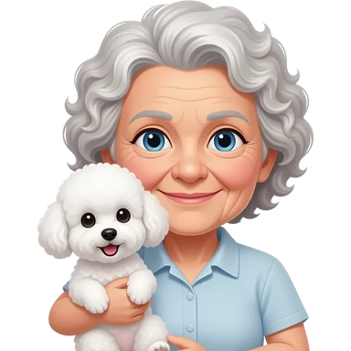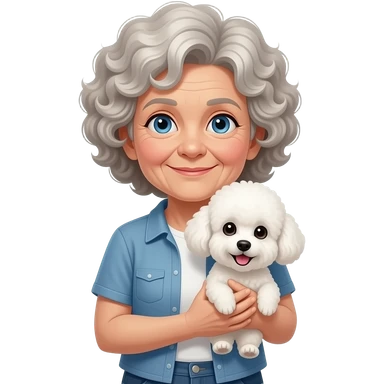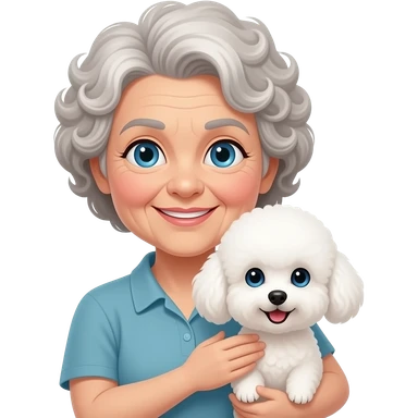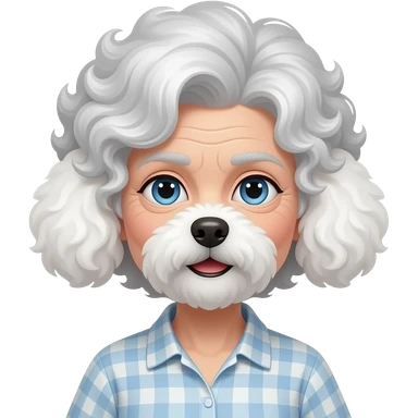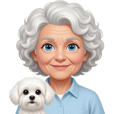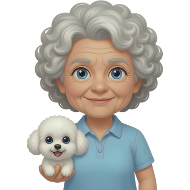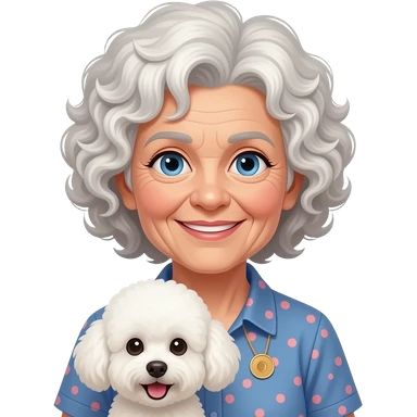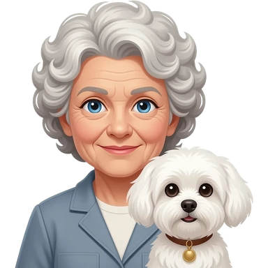 Elder woman curly hair blue eyes with Maltipoo emoji