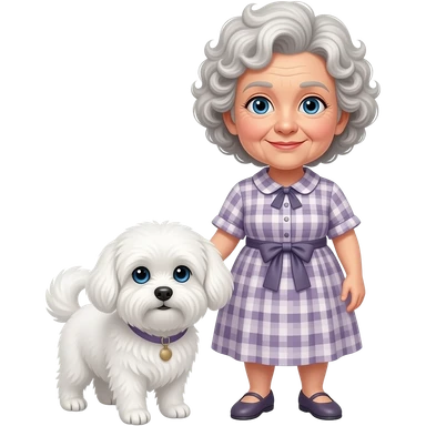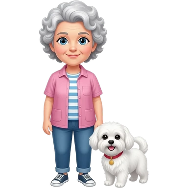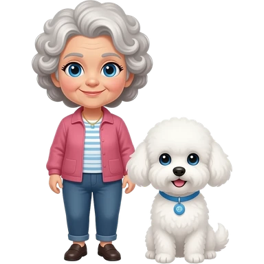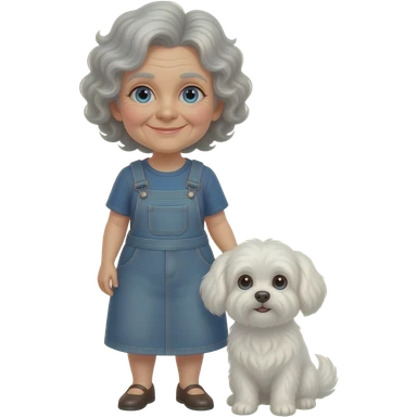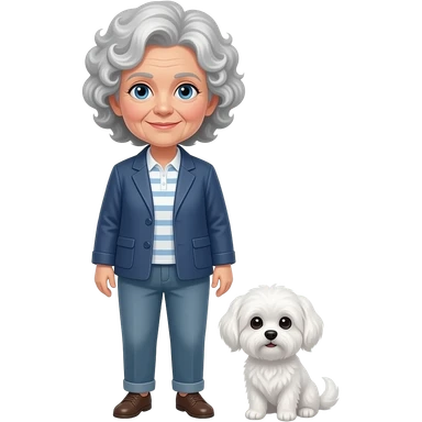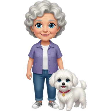 Elder woman curly hair blue eyes standig with a white Maltese dog emoji