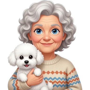 Elder woman curly hair blue eyes having a white Maltipoo emoji