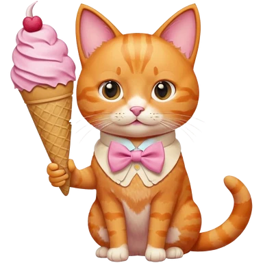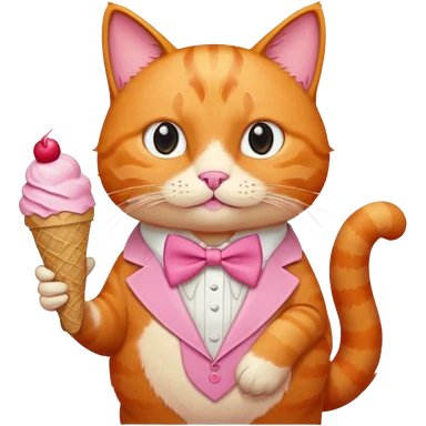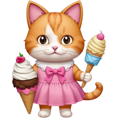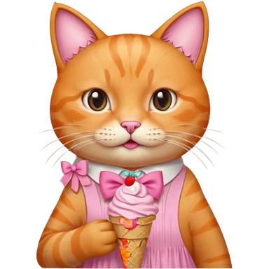 گربه ای نارنجی که لباس و پاپیون صورتی تنشه و بستنی دستشه emoji