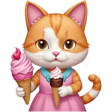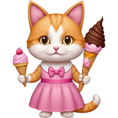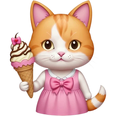 گربهای سفید نارنجی که پاپیون رو سرشه و لباس صورتی تنشه و بستنی شکلاتی قیفی دستشه emoji