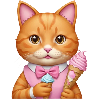 گربه ای نارنجی که لباس و پاپیون صورتی تنشه و پاپیون صورتی رو سرشه بستنی دستشه emoji