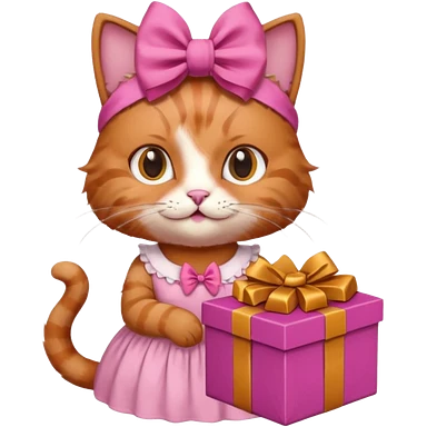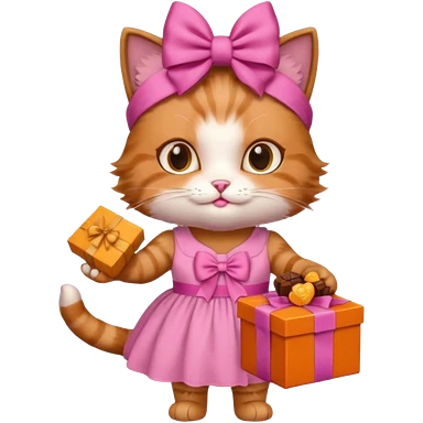 گربه ای سفسد نارنجی که جعبه شکلات دستشه لباسش صورتیه و پاپیون صورتی رو سرشه emoji | AI Emoji Generator