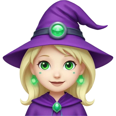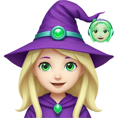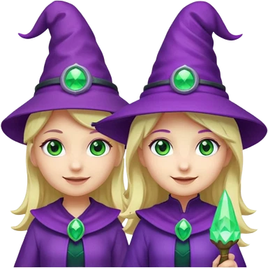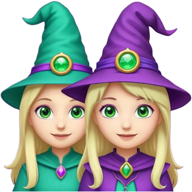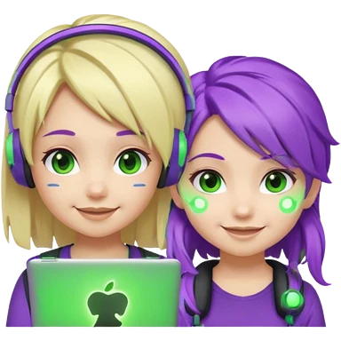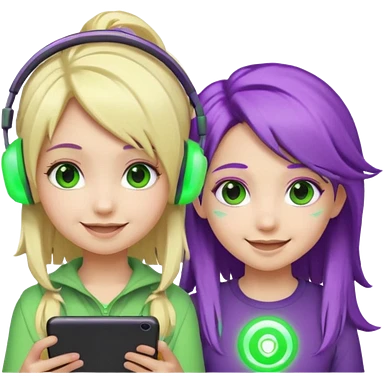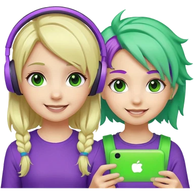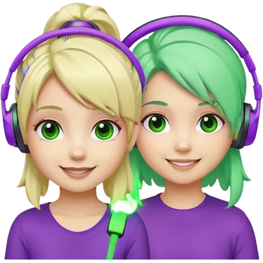 Make a blonde girl with green glowing headset on with teal eyes and a purple haired girl with green eyes waering a purple wit hes hat haveing fun , make them a chibi emoji page emoji