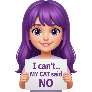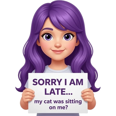 girl with long purple hair with a SORRY I AM LATE... my cat was sitting on me sign emoji