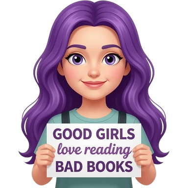girl with long purple hair with a GOOD GIRLS love reading BAD BOOKS sign emoji