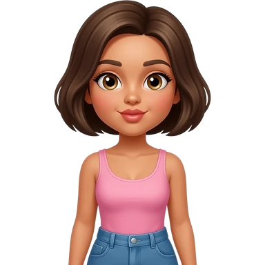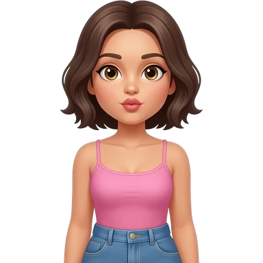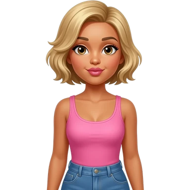 Diva Hazel eyes, tanned skin. Dark blonde very short hair. Pink singlet. Blue jeans. Waist up and blowing kiss. emoji