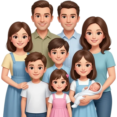 family of 8 white people and all with brown hair with 2 parents with 6 kids 12 year old girl 10 year old boy 9 year old boy 8 year old girl 2 year old girl and newborn girl emoji