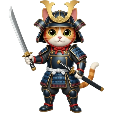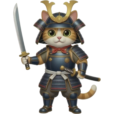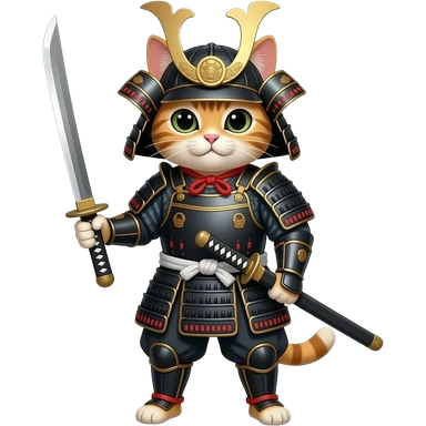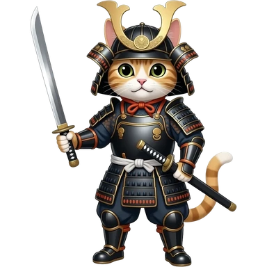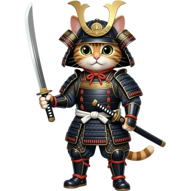 Кіт в японських обладунках з мечем в руках в повний зріст, він людиноподібний emoji