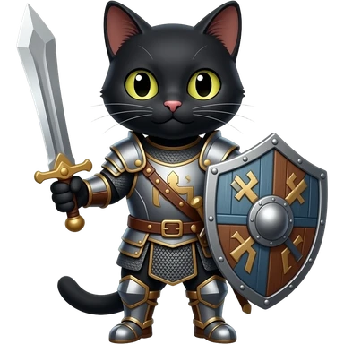 чорнйи кіт в слов'янських обладунках з мечем та щитом в повний зріст emoji