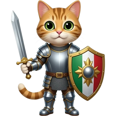 кіт в італьянських обладунках а з мечем та щитом в повний зріст emoji