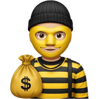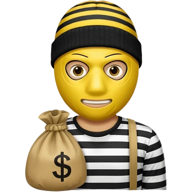 yellow robber wears black eye mask, black beanies and black and white stibes shirt with one brown money bag beside him emoji