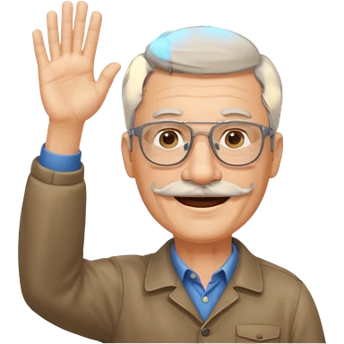 60 yr man with partially gray hair, mustache, light glasses, waving hello emoji