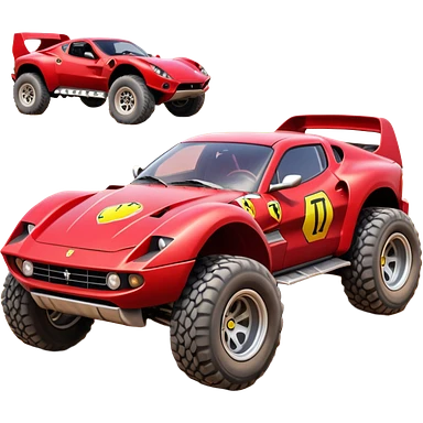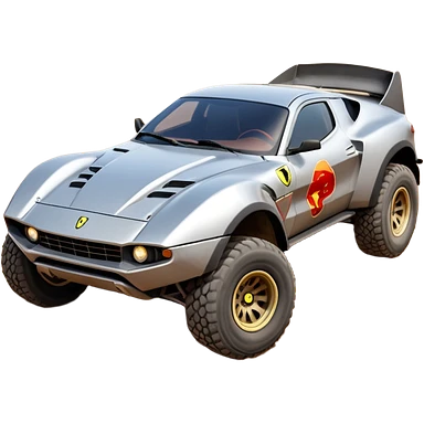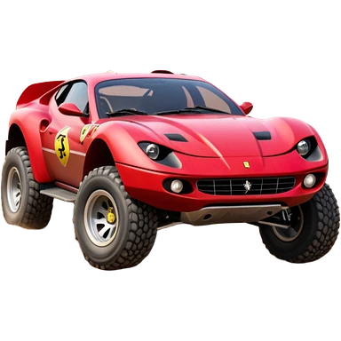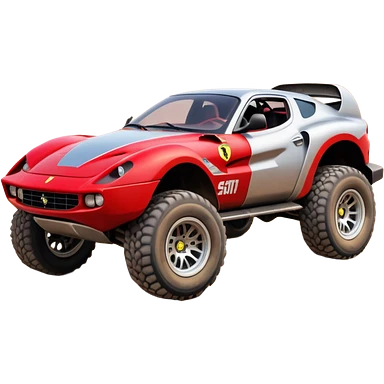 Satan’s RedBull Ferrari -colored Dirty and dented Local Motors Rally Fighter off road race car hot rod trophy truck-style basher flying on a dusty road (silver wheels) emoji