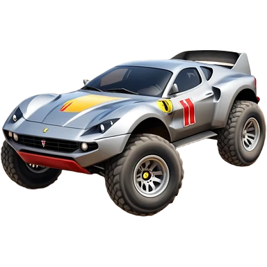 Satan’s Ferrari -colored Dirty and dented Local Motors Rally Fighter off road race car hot rod trophy truck-style basher flying on a dusty road (silver wheels) emoji