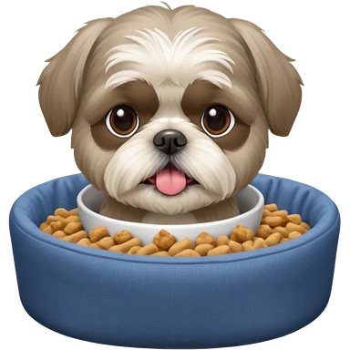 old ALL grey shih tzu in dog bed with bowl of food tongue hanging out emoji